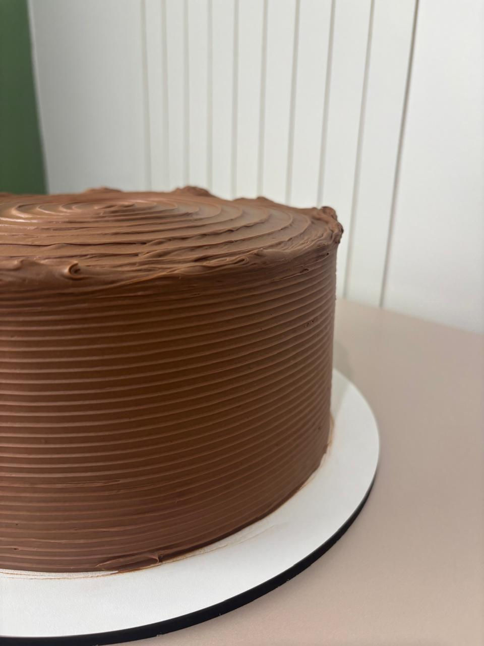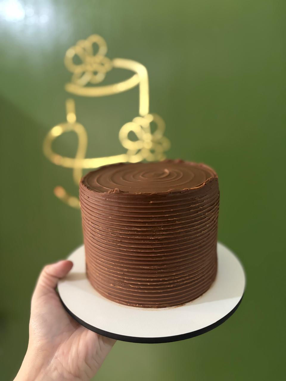 Massa de chocolate com 01 recheio de brigadeiro cremoso e 01 recheio de brigadeiro de pistache, com cobertura de buttercream de chocolate.