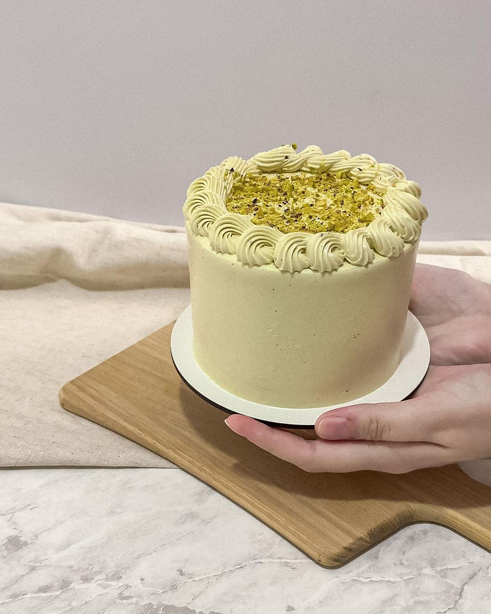 Massa branca com 01 recheio de brigadeiro de baunilha com nossa irresistível geleia artesanal de frutas vermelhas e 01 recheio de brigadeiro de pistache, com cobertura de buttercream de baunilha.
